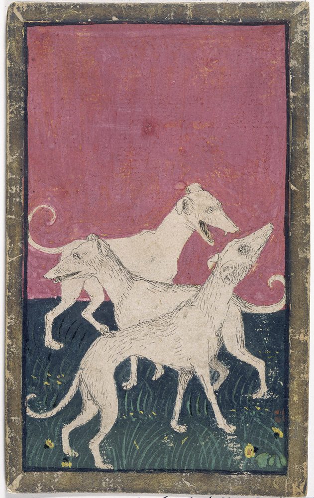 - Spielkarte Jagdhunde Drei. Der Hund spürt den geschlagenen Reiher auf.