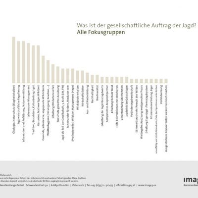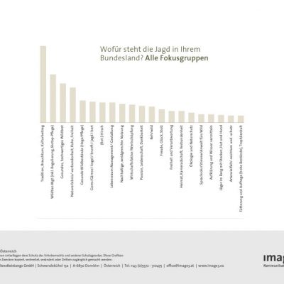 Die Befragung von nahezu 200 Expert/innen, Funktionär/innen und Interessensgruppen-Vertreter/innen in 23 Fokusgruppen fand in allen neun Bundesländern statt. Sie war ein wesentlicher Bestandteil einer Situationsanalyse zum Ist- und Soll-Image der Jagd in Österreich. Sie lieferte wertvolle Impulse für die Entwicklung der Dachmarke „Jagd Österreich“ und wurde durch Expertengespräche sowie mehrere Workshop-Reihen mit allen neun Landesjägermeistern sowie Geschäftsführern der Jagdverbände ergänzt.