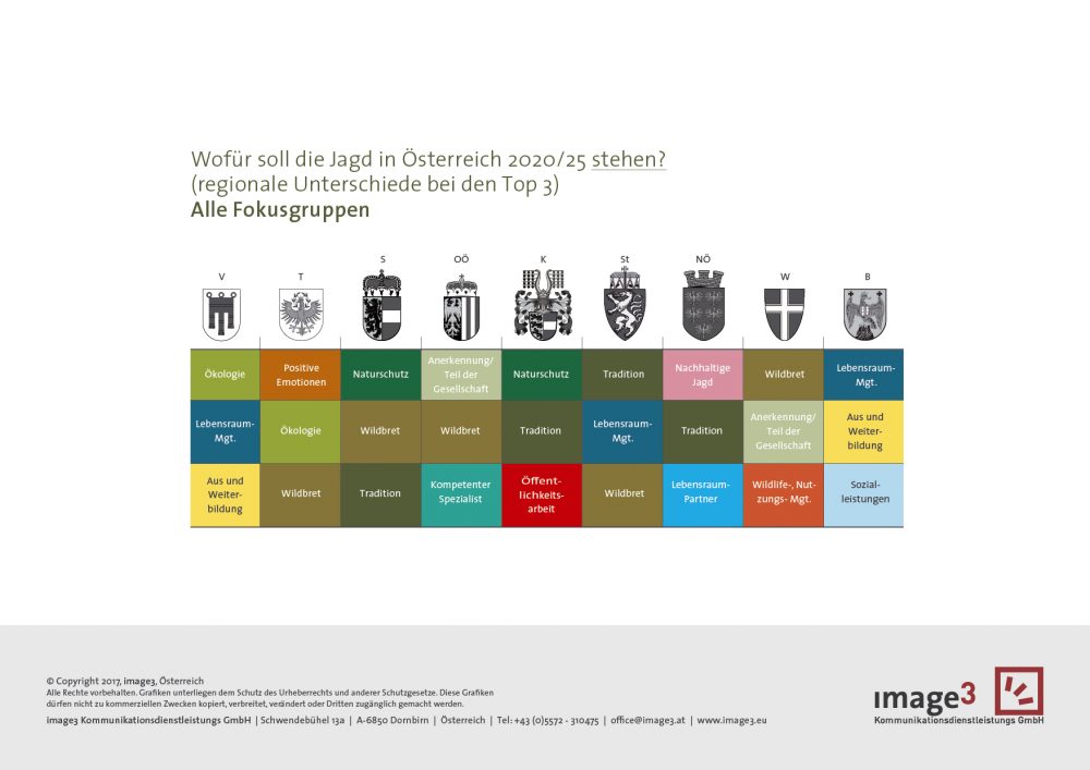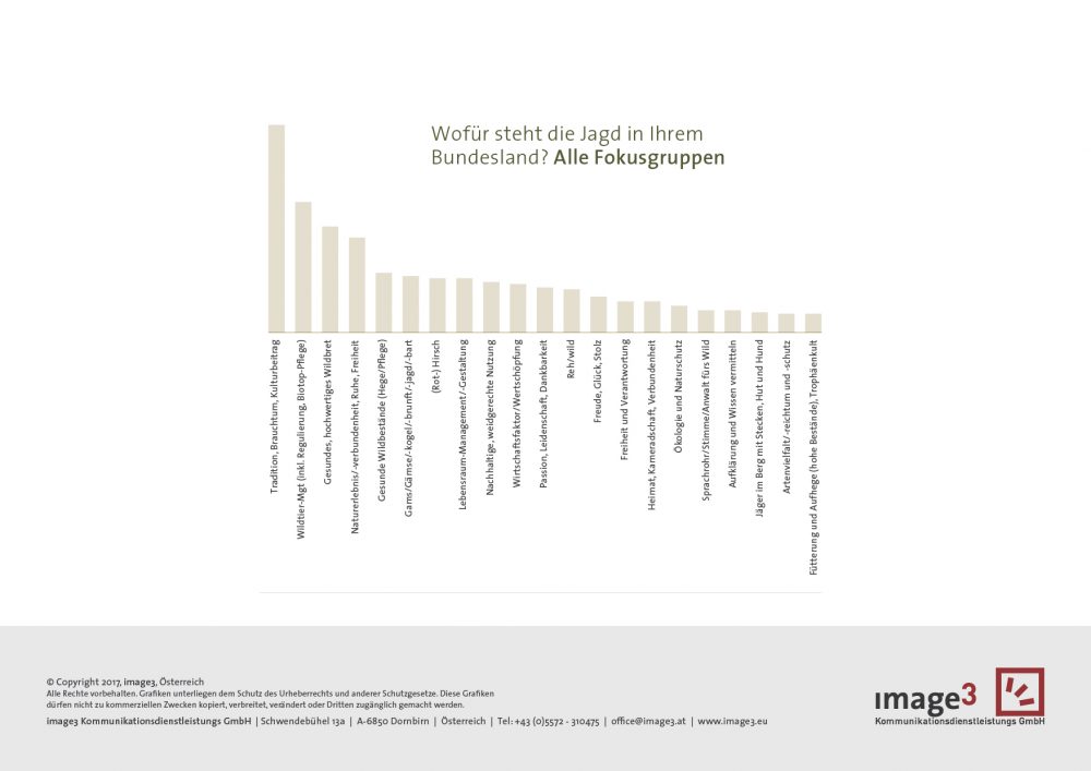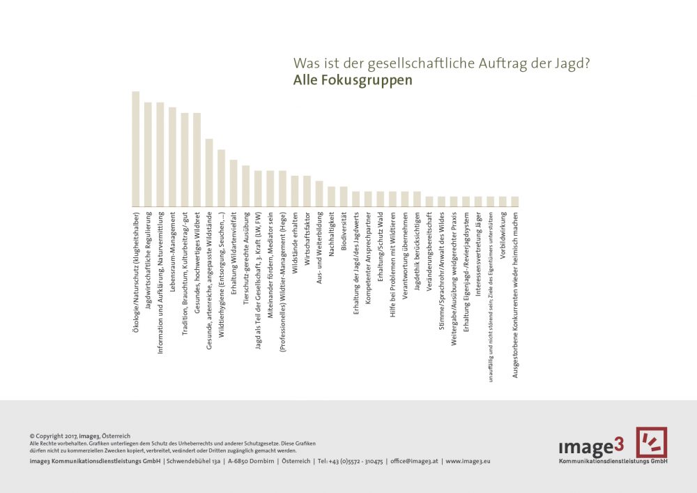 Die Befragung von nahezu 200 Expert/innen, Funktionär/innen und Interessensgruppen-Vertreter/innen in 23 Fokusgruppen fand in allen neun Bundesländern statt. Sie war ein wesentlicher Bestandteil einer Situationsanalyse zum Ist- und Soll-Image der Jagd in Österreich. Sie lieferte wertvolle Impulse für die Entwicklung der Dachmarke „Jagd Österreich“ und wurde durch Expertengespräche sowie mehrere Workshop-Reihen mit allen neun Landesjägermeistern sowie Geschäftsführern der Jagdverbände ergänzt.