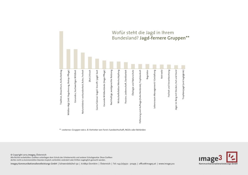 Auffallend ist dabei einerseits, dass jagdnahe (wie Funktionäre, Mitarbeiter, Jagdschutzorgane) und jagdfernere Interessensgruppen (wie Agrar, Forst, Naturschutz, Jagdwirtschaft) diese Identität nahezu gleich beschrieben haben, obwohl sie in unterschiedlichen Fokusgruppen befragt worden sind. Andererseits ergibt sich ebenso ein nahezu identisches Bild, was die Auswertung nach Bundesländern betrifft. Insofern verfügt die Jagd österreichweit – trotz der Organisationsform mit neun Landesjagdverbänden – über ein nahezu einheitliches Image.