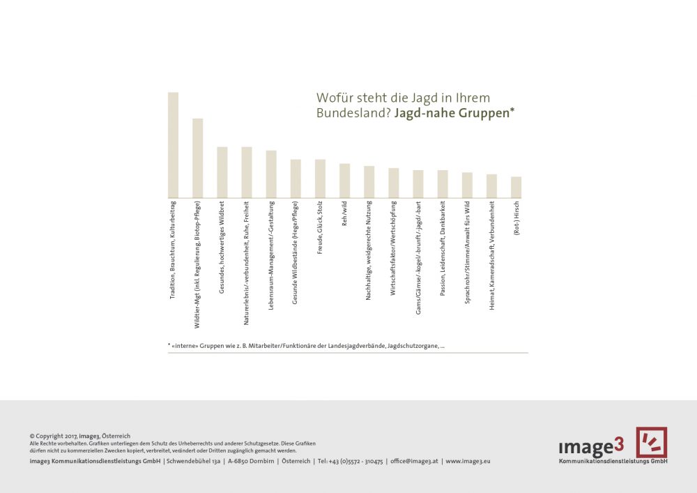 Dabei sollte sich die Jagd in Österreich nach Ansicht der befragten Experten verstärkt als kompetenter Ansprechpartner und Spezialist in Fragen der Wildtiere und der Lebensräume positionieren. Auch in den einzelnen Bundesländer-Ergebnissen trat die Zukunftsvorstellung der nachhaltigen Jagd und des Lebensraum-Managements bzw. Naturschutzes deutlich zutage. Entsprechend sollte der Imagefaktor „Tradition & Brauchtum“ künftig zwar weiterhin eine tragende Rolle spielen, aber nicht mehr so bedeutsam sein wie aktuell.